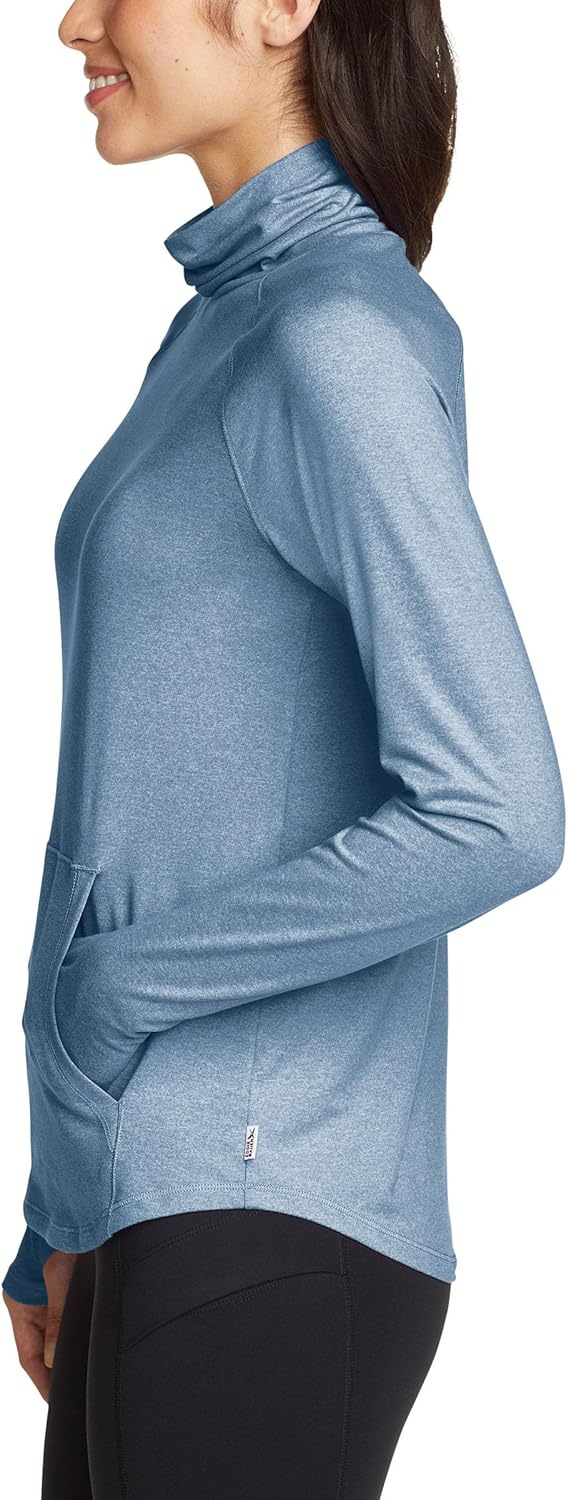 Stay active and comfortable in this versatile women's funnel neck long sleeve top from Eddie Bauer. Designed with mobility in mind, the stretchy fabric allows unrestricted movement during your workouts or daily activities. The UPF 50+ sun protection keeps you shielded from harmful rays, while moisture-wicking technology helps you stay dry and fresh. The thoughtfully designed thumbhole sleeves provide extra coverage and warmth for your hands, and the convenient kangaroo pocket offers a perfect spot to warm your hands or store small essentials. The peached face fabric adds a soft, luxurious feel against your skin. This Eddie Bauer top combines style and functionality, making it an ideal choice for outdoor activities, gym sessions, or casual wear.