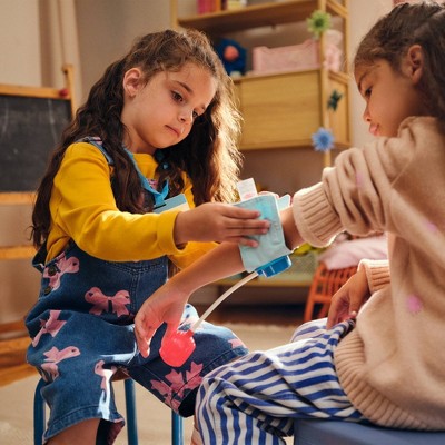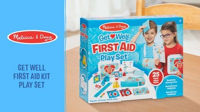 Highlights 25-piece first aid kit play set with realistic pretend first aid essentials to examine and treat injuries Includes wrist cast, splint, sling, wipes and gauze in pouches, long and small bandages, eye dropper bottle, play ice pack, forehead thermometer, activity card, and more Pieces store in handy snap-shut kit for easy cleanup and to take the fun on the go A fun and engaging way to ease any feelings of stress associated with medical procedures and to encourage imaginative, nurturing, and empathetic play Great gift for preschoolers, ages 3 to 6, for hands-on, screen-free play Description Be prepared to respond to pretend play emergencies! The 25-piece Melissa & Doug Get Well First Aid Kit Play Set offers realistic accessories let little healers help the injured get well! Kids three and older can pretend to set breaks and sprains with a wrist cast, splint, and sling, clean wounds with wipes and gauze, bandage boo-boos, and soothe ailments with pretend play tube, spray bottle, eye dropper, and ice pack. A reusable activity card lets kids keep track of their diagnoses and treatments. All the pieces store in the snap-shut first aid box for easy cleanup. The play set is a fun and engaging way to ease any feelings of stress associated with medical visits, and to encourage nurturing and empathetic play. Spark a child’s creativity and imagination, and inspire young healers for years to come!