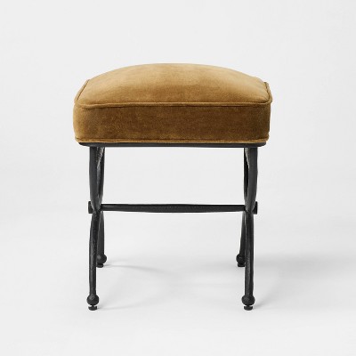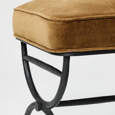 Bring elevated style and functionality to your home with this Metal Ottoman from Threshold⢠designed with Studio McGee. The square ottoman boasts a padded seat in a textured olive-green finish, inviting you to indulge in moments of pure comfort, while the powder-coated black metal frame adds a refined elegance. It stands on sleek legs with a decorative design and a cross stretcher for enhanced visual interest.